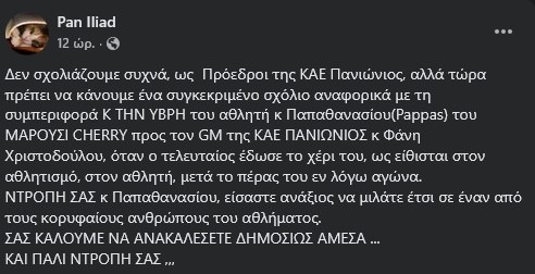«Δεν σχολιάζουμε συχνά, ως Πρόεδροι της ΚΑΕ Πανιώνιος, αλλά τώρα πρέπει να κάνουμε ένα συγκεκριμένο σχόλιο αναφορικά με τη συμπεριφορά Κ ΤΗΝ ΥΒΡΗ του αθλητή κ Παπαθανασίου(Pappas) του ΜΑΡΟΥΣΙ CHERRY προς τον GM της ΚΑΕ ΠΑΝΙΩΝΙΟΣ κ Φάνη Χριστοδούλου, όταν ο τελευταίος έδωσε το χέρι του, ως είθισται στον αθλητισμό, στον αθλητή, μετά το πέρας του εν λόγω αγώνα.