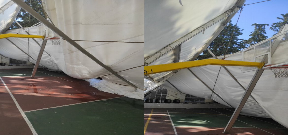 Η τέντα με την οποία είχε σκεπαστεί το ανοιχτό δίπλα στο κλειστό «Αντώνης Φώτσης» καταστράφηκε, καθώς δεν άντεξε το βάρος του χιονιού που έπεσε.