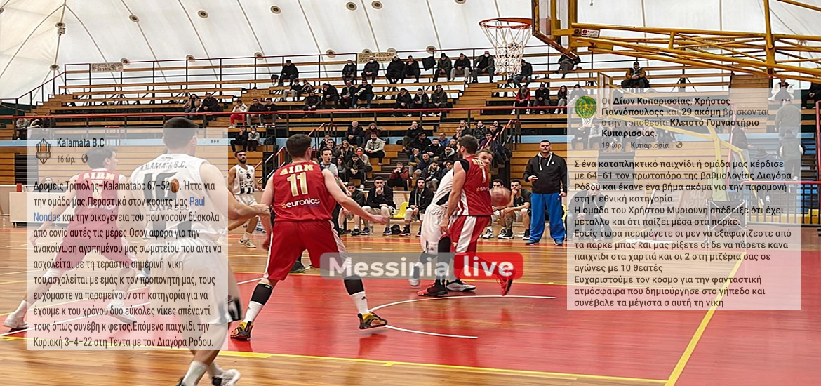 Έτσι, μέσω της επίσημης σελίδας και σε επίσημη ανακοίνωση οι άνθρωποι του Διώνα ανέφεραν : «Σ ένα καταπληκτικό παιχνίδι ή ομάδα μας κέρδισε με 64-61 τον πρωτοπόρο της βαθμολογίας Διαγόρα Ρόδου και έκανε ένα βήμα ακόμα για την παραμονή στη Γ εθνική κατηγορία.Η ομάδα του Χρήστου Μυριούνη απέδειξε ότι έχει μέταλλο και ότι παίζει μέσα στα παρκέ.