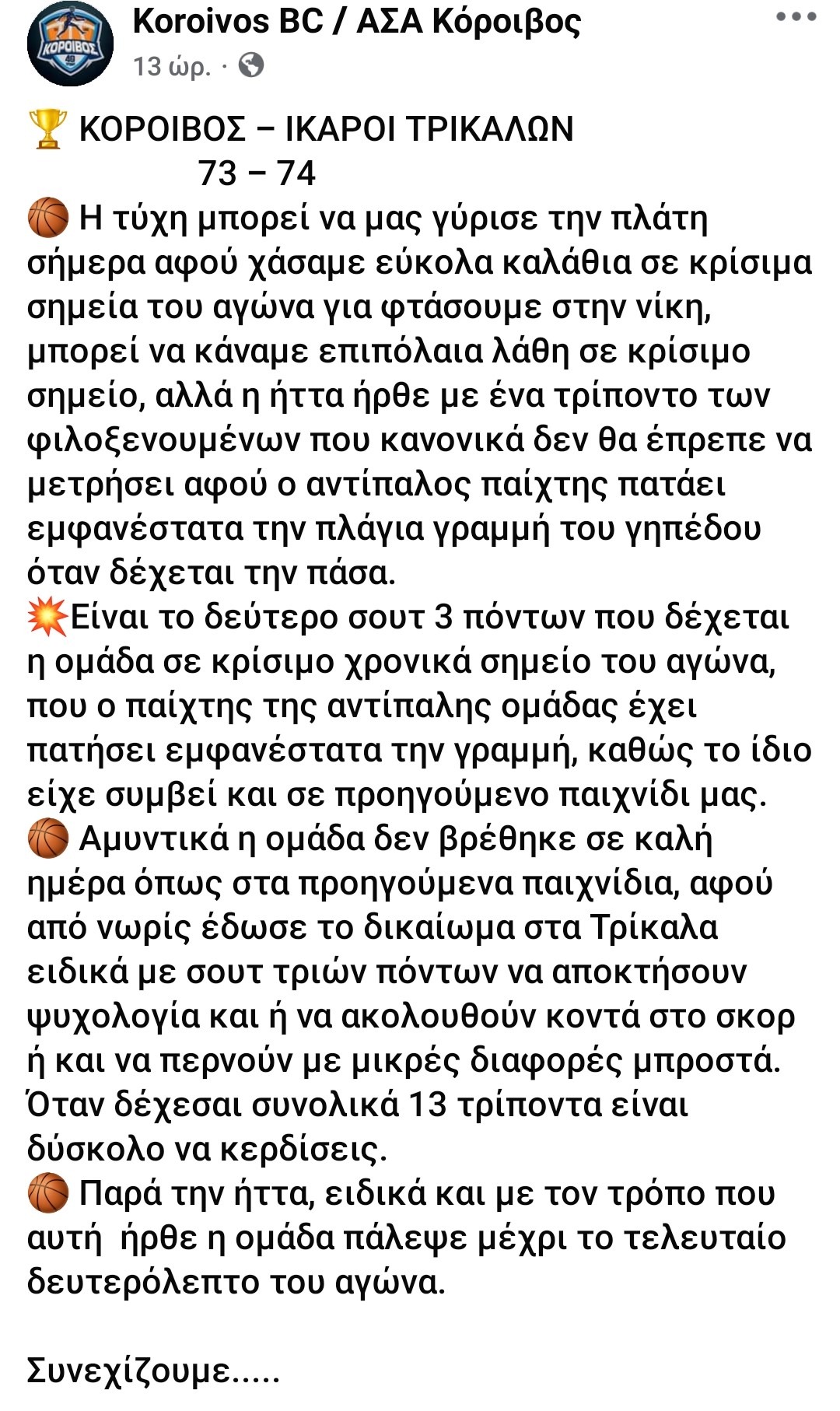 Τη δεύτερη του ήττα υπέστη στο πρωτάθλημα της Elite League ο Κόροιβος, αλλά στη περιγραφή του αγώνα διαμαρτύρονται για το νικητήριο τρίποντο των φιλοξενούμενων, αναφέροντας ότι ο παίκτης των Θεσσαλών πατάει την πλάγια γραμμή.