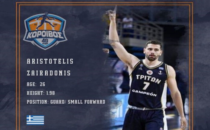 Στον Κόροιβο θα αγωνίζεται τη νέα αγωνιστική σεζόν ο Αριστοτέλης Ζαραϊδώνης (1,95 – 26 ετών) που μαζί με τον τωρινό προπονητή του είχαν πανηγυρίσει την άνοδο του Τρίτωνα στην Basket League πριν από δυο σεζόν.