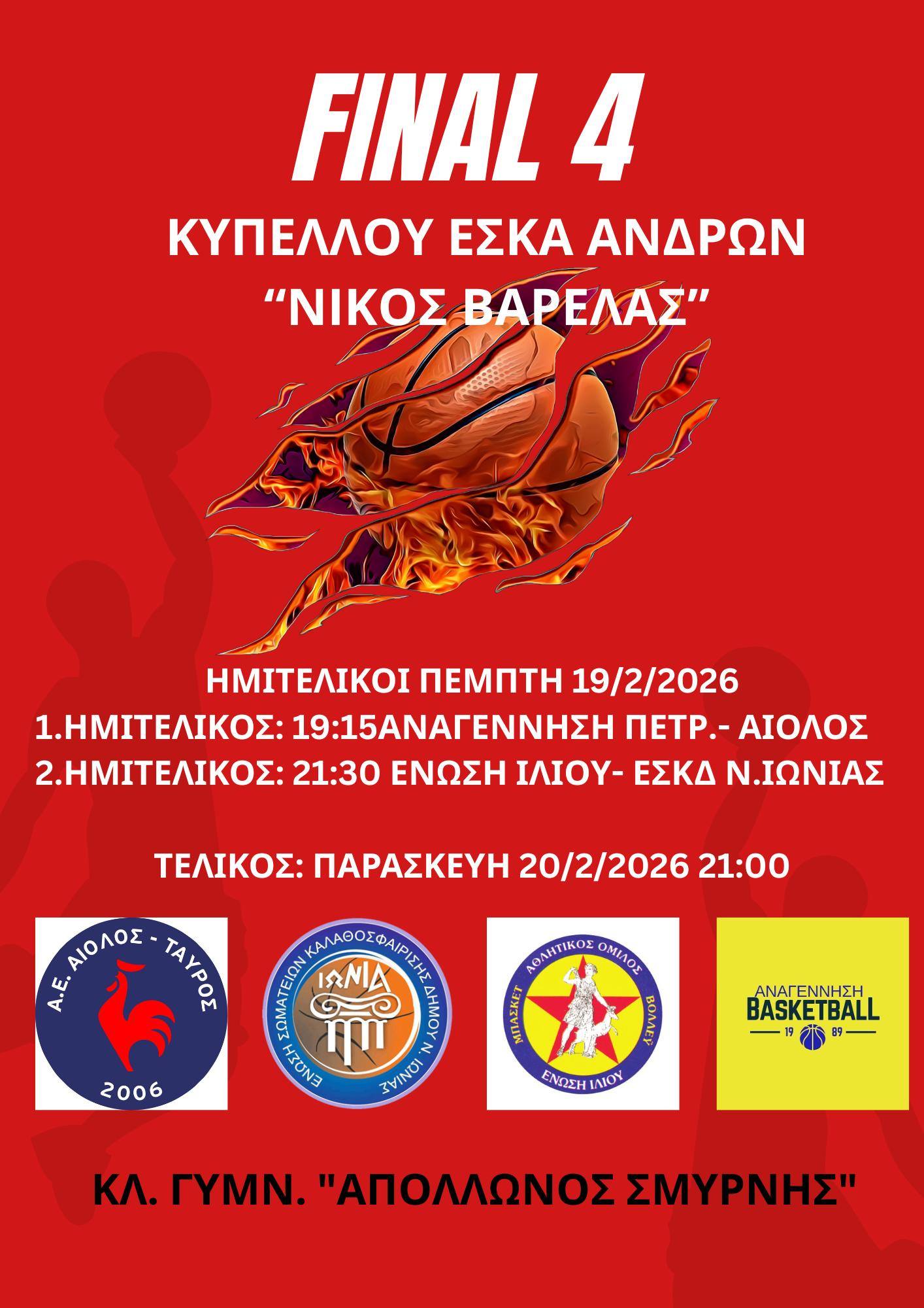 Η ώρα του Final-4 Κυπέλλου ΕΣΚΑ Ανδρών “Νίκος Βαρελάς” (19-20/2) έφτασε και οι τέσσερις προπονητές των φιναλίστ που διεκδικούν το τρόπαιο μιλώντας στον Θοδωρή Λινάρδο ανέλυσαν τα δεδομένα. Την Πέμπτη 19/2 και ώρα 19:15 στο κλειστό του Απόλλωνα η Αναγέννηση αντιμετωπίζει τον Αίολο και στις 21:30 διεξάγεται ο έτερος ημιτελικός ανάμεσα σε Ένωση Ιλίου και Νέα Ιωνία. Ο τελικός θα πραγματοποιηθεί μία μέρα μετά 20/2 και ώρα 21:00 στο κλειστό του Απόλλωνα.