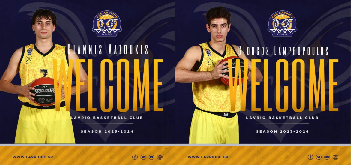 «Η ΚΑΕ Λαύριο Megabolt ανακοινώνει τη συμφωνία της με τους αθλητές Γιάννη Βαζούκη και Γιώργο Λαμπρόπουλο για την αγωνιστική περίοδο 2023-2024.