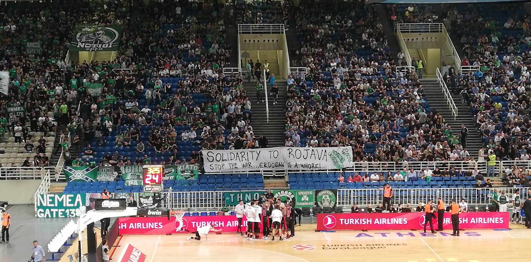 Οι οπαδοί του Παναθηναϊκού σήκωσαν ένα πανό λίγο πριν την έναρξη του αγώνα με τη Μιλάνο στο ΟΑΚΑ, στο οποίο έδιναν ένα ξεκάθαρα μήνυμα για τα πολιτικά τεκταινόμενα, με την εισβολη της Τουρκίας στη Συρία. Το πανό έγραφε στα αγγλικά "Αλληλεγγύη στη Ροχάβα. Σταματήστε τον πόλεμο..".