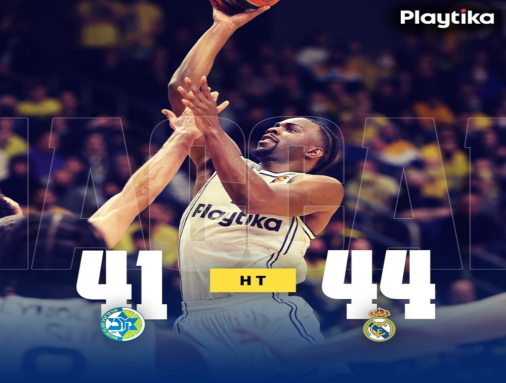 Οι δύο ομάδες ξεκίνησαν δυναμικά την αναμέτρηση, μην αφήνοντας η μία την άλλη να αποκτήσει κάποιο μεγάλο προβάδισμα. Χαρακτηριστικό παράδειγμα, το γεγονός ότι είχαμε εφτά εναλλαγές στο προβάδισμα, μόλις στο πρώτο δεκάλεπτο. Το σκορ της πρώτης περιόδου ήταν 21-20 υπέρ της Ρεάλ, με τον Γκερσόν Γιαμπουσέλε να έχει ήδη 14 πόντους. Η μάχη συνεχίστηκε και στο δεύτερο δεκάλεπτο με τις ομάδες να πάνε χέρι-χέρι. Η Ρεάλ «ακουμπούσε» τη μπάλα στο ζωγραφιστό, η άμυνα της Μακάμπι έκλεινε με αποτέλεσμα οι Μαδριλένοι να βρουν αρκετά τρίποντα. Πιο συγκεκριμένα είχαν 7/18 τρίποντα (ημιχρ.) ενώ στον αντίποδα οι Ισραηλινοί έβρισκαν τους πόντους τους κοντά στο καλάθι. Ο Γιαμπουσέλε «ηρέμησε» έμεινε στους 14 πόντους που είχε στη πρώτη περίοδο, ενώ για τους γηπεδούχους ο Τζέιμς Νάναλι σημείωσε εφτά πόντους στο δεύτερο δεκάλεπτο. Το ημίχρονο έκλεισε στο 44-41 υπέρ των Ισπανών, με το μεγαλύτερο προβάδισμα στην αναμέτρηση να είναι οι τέσσερις πόντοι δείγμα του πόσο κοντά βρίσκονταν οι δύο ομάδες.