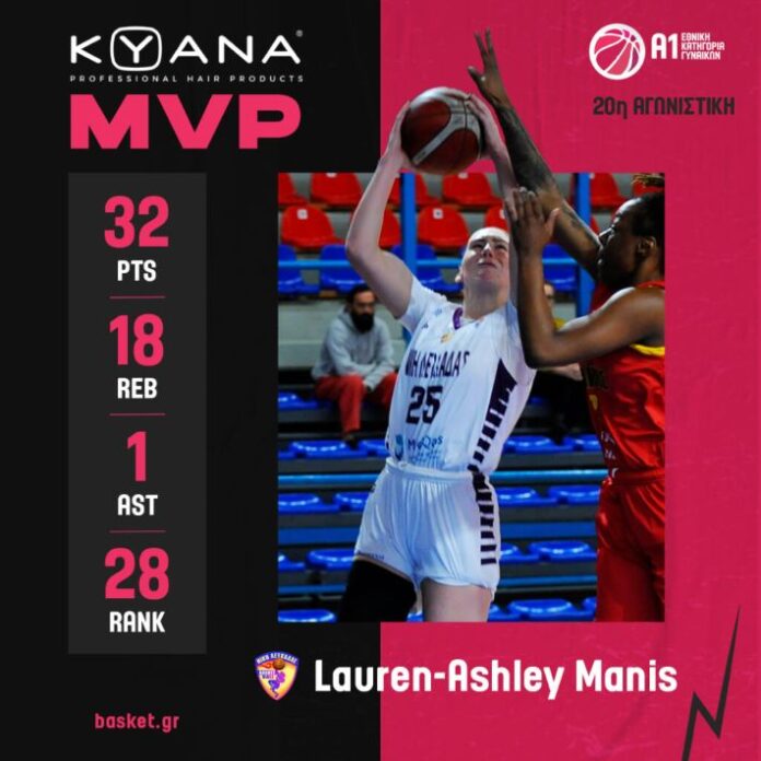 Η Λόρεν Μανίς στην επικράτηση της ομάδας της με 80-77 στην παράταση με αντίπαλο τον Αθηναϊκό είχε 32 πόντους, 18 ριμπάουντ, μία ασίστ, ένα κλέψιμο, μία τάπα και 28 στο σύστημα αξιολόγησης σε 42’48’’ λεπτά συμμετοχής.