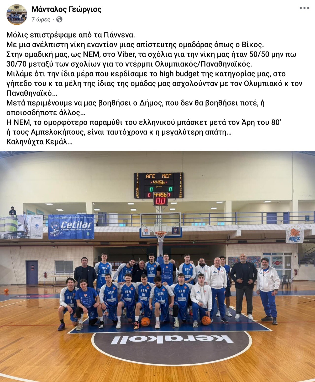 Ωστόσο, ο Γιώργος Μάνταλος κατά την επιστροφή της ομάδας του στα Μέγαρα με ανάρτηση του αναφέρθηκε στο γεγονός ότι οι περισσότεροι εντός της ομάδας ασχολούταν με τον τελικό του Κυπέλλου των «αιωνίων».