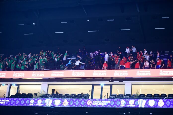 Μικρή ένταση ανάμεσα σε οπαδούς του Ολυμπιακού και του Παναθηναϊκού περίπου μία ώρα πριν από το τζάμπολ του μικρού τελικού.
