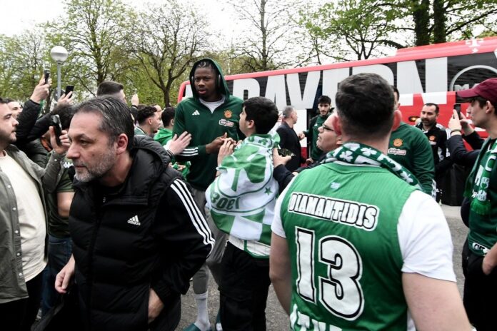 Οπαδοί του Παναθηναϊκού αποθέωσαν την αποστολή των «πράσινων» κατά την άφιξή της στην «BMW arena» για το εκτός έδρας παιχνίδι με την Μπάγερν Μονάχου.