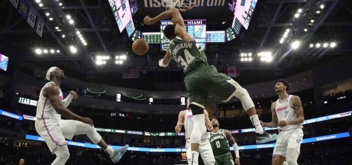 O Γιάννης Αντετοκούνμπο ήταν «διπλός» και στη νίκη των Μιλγουόκι Μπακς επί των Μαϊάμι Χιτ στο «Fiserv Forum».