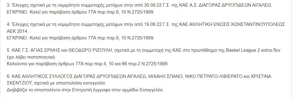 Η μία αφορά στον Ερμή Αγιάς και τον Θόδωρο Ριζούλη και για να μη μπερδευόμαστε, αφορά στην ομάδα που πλέον αγωνίζεται ως ΚΑΕ Ηρακλής 2022 (εμπορικό όνομα) στην Elite League. Οπως προκύπτει, το κάνει αυτό χωρίς να έχει λάβει πιστοποιητικό και εγκαλείται, κάτι που σύμφωνα με τον ισχύοντα νόμο μεταφράζεται σε ποινή αφαίρεσης βαθμών και όχι σε στέρηση του δικαιώματος συμμετοχής.