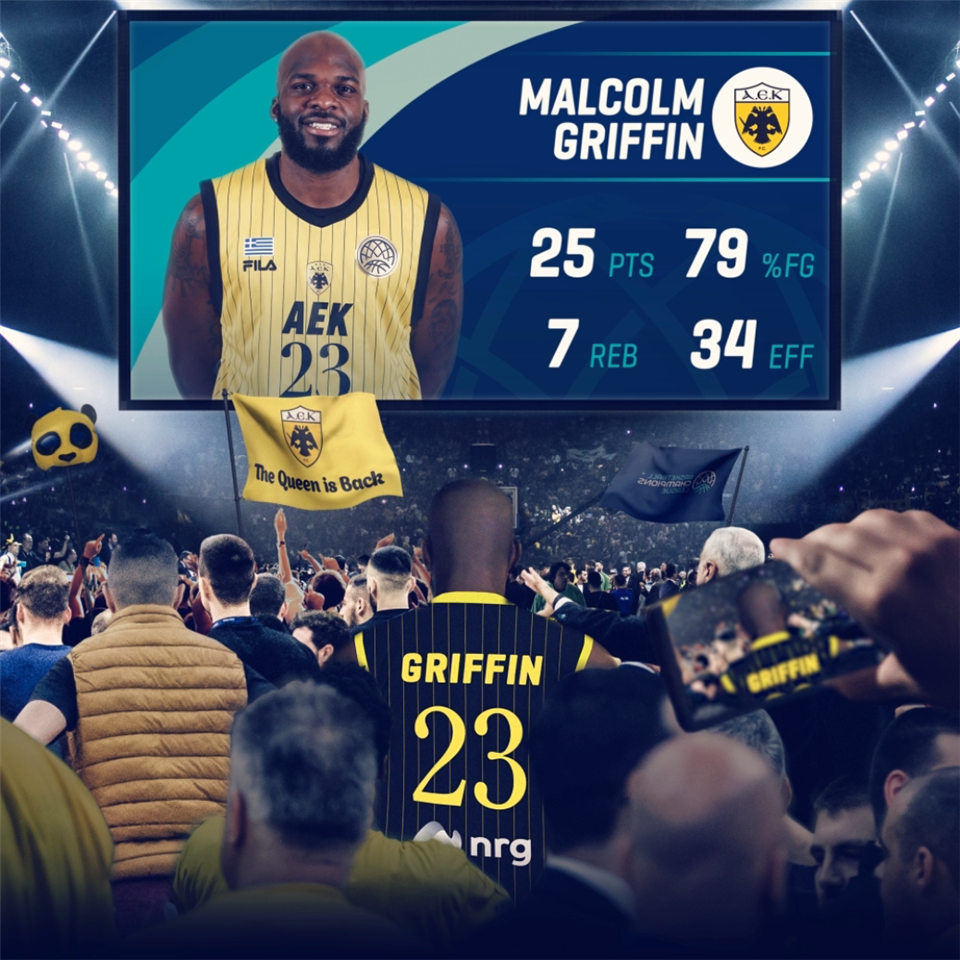 O Μάλκολμ Γκρίφιν αναδείχθηκε πολυτιμότερος παίκτης της 8ης αγωνιστικής της κανονικής περιόδου του Basketball Champions League, συμβάλλοντας καθοριστικά στη νίκη της ΑΕΚ επί της Χάποελ Ιερουσαλήμ στην «Pais Arena».