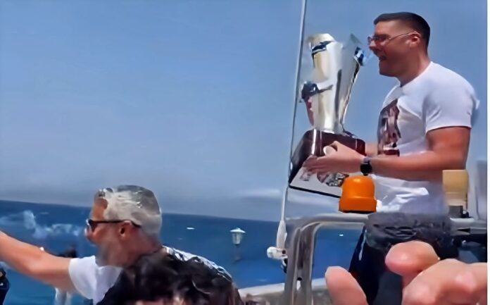 Ο κόσμος που βρισκόταν στη προβλήτα φώναζε μαζί με την ομάδα «Βουντού Βουντού, Μύκονο είσαι μια, το κύπελλο το φέραμε από τη Θεσσαλία», ενώ ακούστηκε και σύνθημα για ευρωπαϊκό και το κλασικό «Νάτοι νάτοι οι πρωταθλητές».