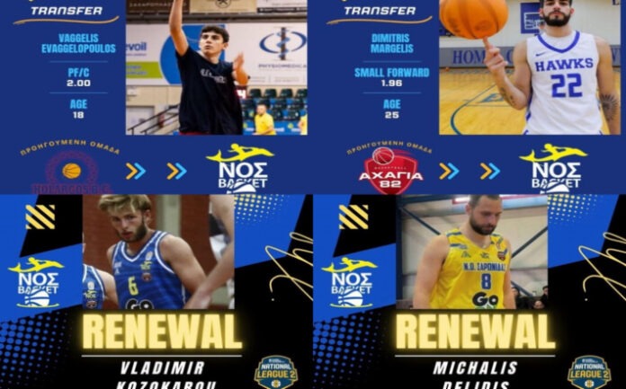 Στον ΝΟΣ θα συνεχίσουν ο πολύπειρος Μιχάλης Δελίδης (1,91 – 31 ετών, 11,7 π., 48 τριπ.) και Βλαντιμίρ Κοζοκάρου (1,95 – 22 ετών, 5,8 π., 15 τριπ.).