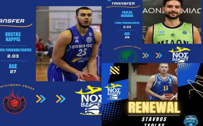 Δεν θα μπορούσε να απουσιάζει από το ρόστερ ο αρχηγός του ΝΟΣ, Σταύρος Τσόλας (1,84 – 26 ετών, 2,6 π., - 6 τριπ.) που πλέον την ακολουθεί από την Β’ ΕΣΚΑ ως και την National League 1, ενώ μεγάλος στόχος για τη περιφερειακή γραμμή είναι ο Γρηγόρης Συμεών Οουαντίντζο Βλαδίτση (1,84 - 27 ετών).