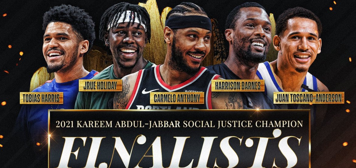 Carmelo Anthony (@carmeloanthony), Harrison Barnes (@hbarnes), Tobias Harris (@tobias31), Jrue Holiday (@Jrue_Holiday11) and Juan Toscano-Anderson (@juanonjuan10) have been selected as the five finalists for the inaugural Kareem Abdul-Jabbar #SocialJusticeChampion Award. pic.twitter.com/XbXDBlS4v6