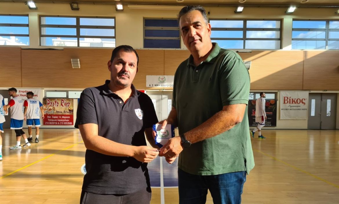Στο ημίχρονο της αναμέτρησης που διεξήχθη την Κυριακή 16/10 στο κλειστό της Κοκκινιάς, ο Γενικός Αρχηγός της Νίκης Αμαρουσίου στο μπάσκετ και μέλος του Δ.Σ., Βασίλης Κωνσταντακόπουλος παρέδωσε ένα αναμνηστικό του σωματείου στο μέλος της διοίκησης της Ε.Α.ΚΑ., Γιώργο Οικονόμου που βρέθηκε στο γήπεδο.