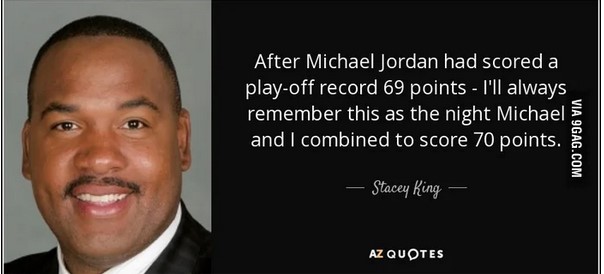 Ο Στέισι Κινγκ αγωνίστηκε για οχτώ χρόνια στους Σικάγο Μπουλς και κατέκτησε τρία πρωταθλήματα, το 1991, το 1992 και το 1993. Πλέον εργάζεται στο NBC Sports Chicago και καλύπτει τους αγώνες των "ταύρων". Ίσως περισσότεροι των θυμούνται περισσότερο από μια από τις πλέον... πιασάρικες φράσεις στην ιστορία του μπάσκετ. Όταν ο Τζόρνταν είχε κάνει ιστορικό ρεκόρ σημειώνοντας 69 πόντους σε έναν αγώνα play off είχε δηλώσει: "Πάντα θα θυμάμαι τη νύχτα που εγώ και ο Μάικλ σημειώσαμε συνολικά 70 πόντους!"