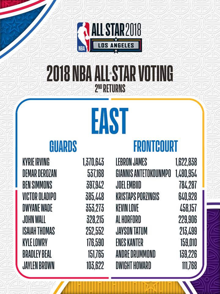 Το ΝΒΑ ανακοίνωσε τα δεύτερη σειρά αποτελεσμάτων της ψηφοφορίας για το all star game και αυτή τη φορά ο Γιάννης Αντετοκούνμπο βρίσκεται πίσω από τον ΛεΜπρόν Τζέιμς. Ο "Βασιλιάς" έχει κάνει ντεμαράζ και έχει περάσει στην πρώτη θέση των παικτών από την Ανατολή έχοντας συγκεντρώσει μέχρι στιγμής 1.622.838 ψήφους αφήνοντας δεύτερο με 1.480.954 ψήφους τον Αντετοκούνμπο, ο οποίος-θυμίζουμε-ήταν πρώτος όταν δημοσιεύτηκε η πρώτη σειρά αποτελεσμάτων. Στην τρίτη θέση των φόργουορντ, που δίνει θέση στην βασική πεντάδα του all star game, βρίσκεται ο Τζόελ Εμπίιντ.