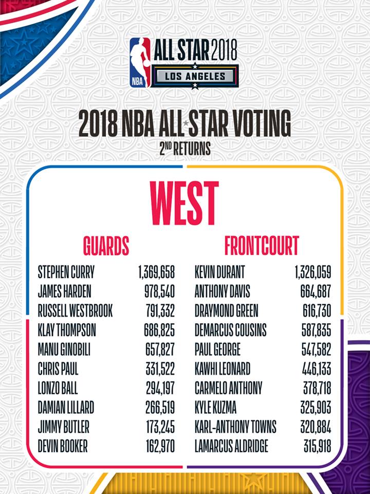 Στη Δύση ο Στεφ Κάρι και ο Κέβιν Ντουράντ προηγούνται άνετα στις κατηγορίες των γκαρντ και των φόργουορντ, ωστόσο η μεταξύ τους μονομαχία είναι πολύ αμφίρροπη. Ο Κάρι προηγείται μόλις κατά 43.000 ψήφους.