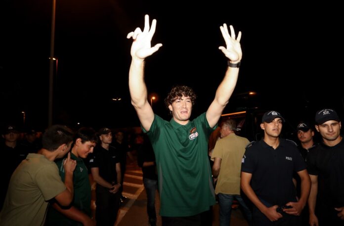 Συγκεκριμένα, ο Τούρκος σταρ φρόντισε να... ξεσηκώσει τον κόσμο που βρέθηκε εκεί για να τον υποδεχτεί, αφού σήκωσε τα 8 δάχτυλά του, αναφερόμενος φυσικά στο 8ο ευρωπαϊκό τρόπαιο το οποίο θα «κυνηγήσει» τη φετινή σεζόν ο Παναθηναϊκός.