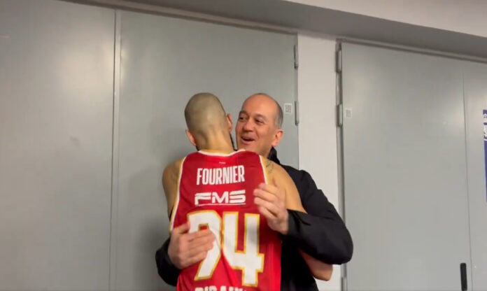 Μετά το μεγάλο «διπλό» στην Μαδρίτη, ο Γιώργος Αγγελόπουλος χαιρέτησε τους παίκτες στα αποδυτήρια και ο Φουρνιέ θέλησε να... συγχαρεί τον Γιώργο Μπαρτζώκα για την ομιλία του.