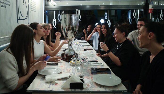 Ο Ολυμπιακός επικράτησε του Παναθηναϊκού στον πέμπτο τελικό και έφτασε έτσι στην 8η κατάκτηση του πρωταθλήματος Γυναικών. Μια ημέρα μετά (29/4) οι «ερυθρόλευκες» γευμάτισαν σε γνωστό εστιατόριο της Πειραϊκής, με την κούπα να έχει την ξεχωριστή της θέση.