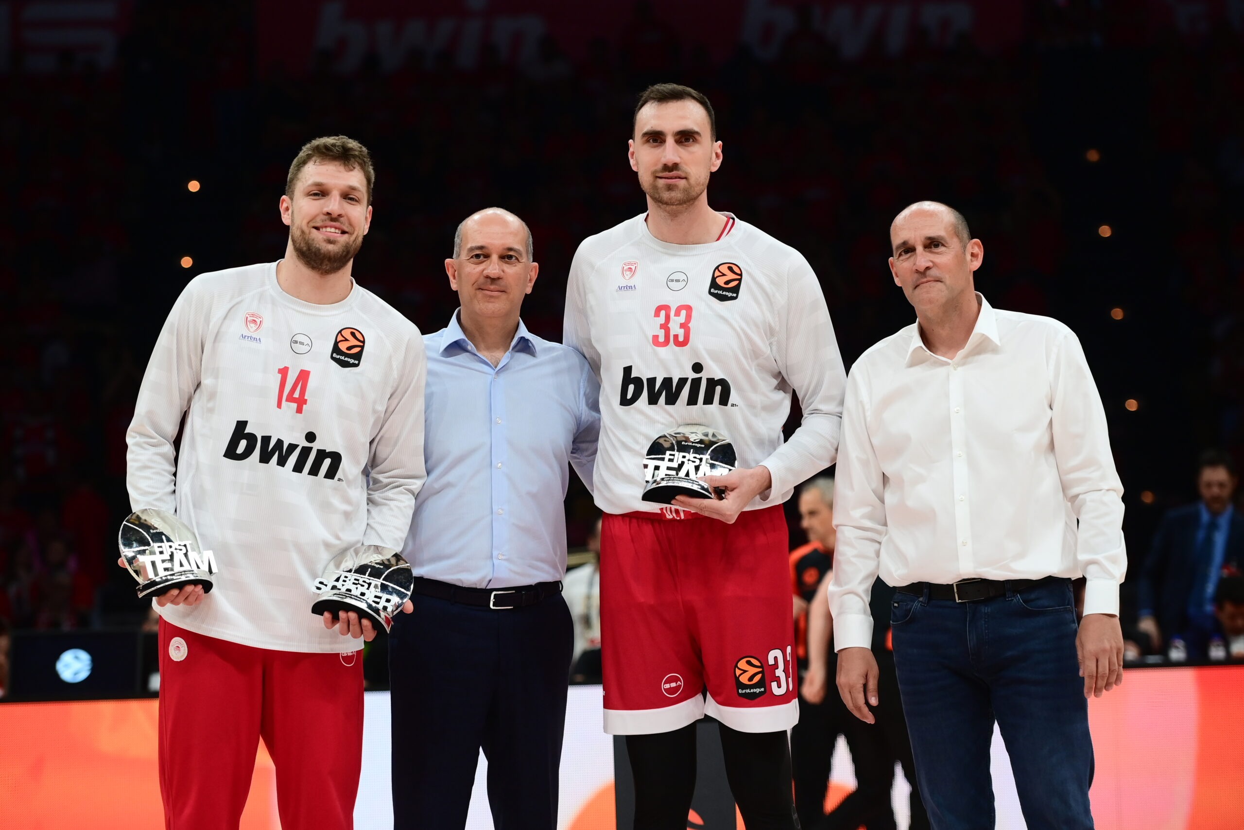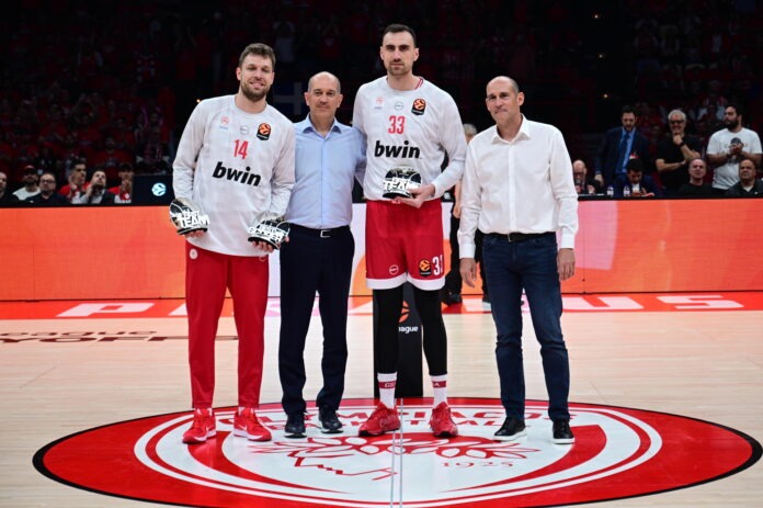 Ξεχωριστή στιγμή πριν από την έναρξη του Game 1 ανάμεσα σε Ολυμπιακό και Μονακό στο ΣΕΦ, με τους Γιώργο και Παναγιώτη Αγγελόπουλο να βραβεύουν τους Σάσα Βεζένκοβ και Νίκολα Μιλουτίνοβ.