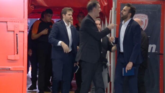 Ένταση προκλήθηκε μετά την ολοκλήρωση της αναμέτρησης του Ολυμπιακού και της Μπαρτσελόνα ανάμεσα στον Γιώργο Μπαρτζώκα και στον συνεργάτη του Ρότζερ Γκριμάου, Βίκτορ Σάδα.