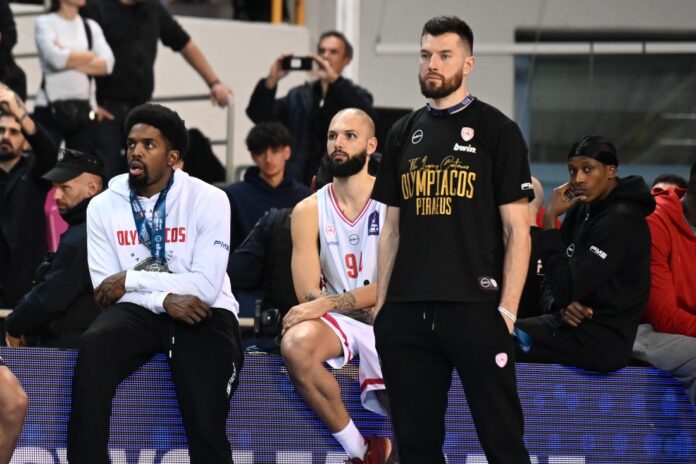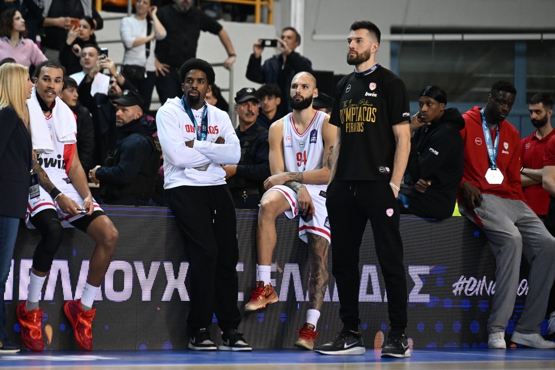 Όπως τότε με τον Χουάντσο Ερνανγκόμεθ στο ΣΕΦ τον περασμένο Ιούνιο μετά την κατάκτηση του Πρωταθλήματος του Ολυμπιακού απέναντι στον «αιώνιο» του αντίπαλο, έτσι και αρκετοί από το «ερυθρόλευκο» ρόστερ, κάθισαν στο παρκέ για να δουν την απονομή του Κυπέλλου στον Παναθηναϊκό.