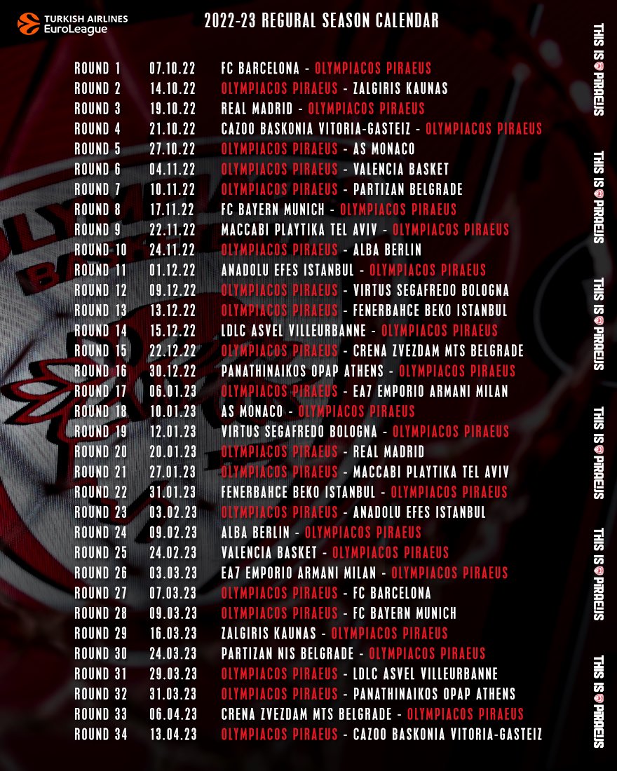 Ολυμπιακός: Ολο το πρόγραμμα των αγώνων του στην Ευρωλίγκα (pic)