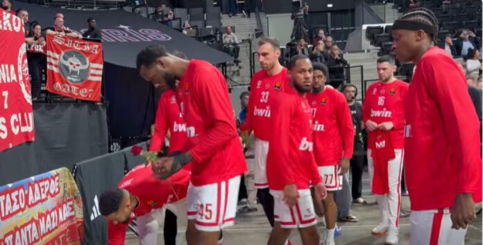 Οι παίκτες του Ολυμπιακού πριν το τζάμπολ απέναντι στην Παρί στην «Adidas Arena» κατέθεσαν λουλούδια μπροστά από το πανό του αδικοχαμένου Τάσου, οπαδό των Ερυθρόλευκων που έχασε τη ζωή του λίγες ώρες πριν.