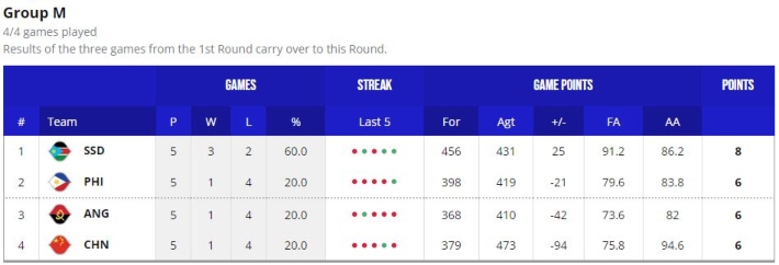 Στον Μ' όμιλο, Το Νότιο Σουδάν πήρε μία ευρεία νίκη με 101-78 επί της Αγκόλα ενώ οι οικοδέσποινες Φιλιππίνες πέρασαν εύκολα το εμπόδιο της Κίνας αφού επικράτησαν με 96-75.