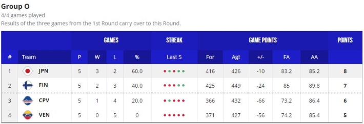 Η οικοδέσποινα Ιαπωνία νίκησε με 80-71 το Πράσινο Ακρωτήρι στον Ο' όμιλο ενώ στην έτερη αναμέτρηση του γκρουπ λίγο νωρίτερα, η Φινλανδία δεν δυσκολεύτηκε κόντρα στην Βενεζουέλα και νίκησε με 90-75.