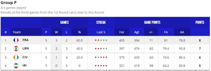 Τέλος, για τον Π' όμιλο, η Γαλλία πήρε την νίκη επί της Ακτής Ελεφαντοστού με 87-77 και στο τελευταίο παιχνίδι της ημέρας, ο Λίβανος κατάφερε να επιβληθεί του Ιράν με 81-73.
