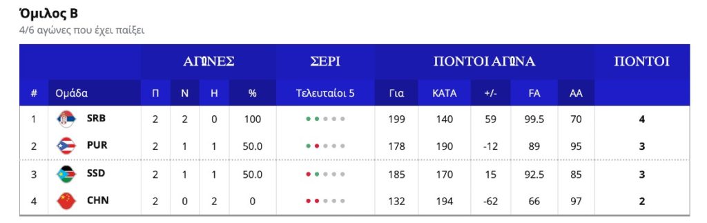 Στον δεύτερο όμιλο το Νότιο Σουδάν δεν αντιμετώπισε κανένα πρόβλημα απέναντι στη Κίνα και επικράτησε με 89-69. Η Σερβία διέλυσε το Πουέρτο Ρίκο με 94-77 και έτσι προκρίθηκε στην επόμενη φάση. Η δεύτερη θέση θα κριθεί την τελευταία αγωνιστική ανάμεσα σε Πουέρτο Ρίκο και Νότιο Σουδάν. Το Πουέρτο Ρίκο αντιμετωπίζει τη Κίνα, ενώ το Νότιο Σουδάν τη Σερβία.