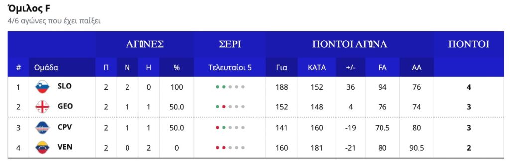 Στον έκτο όμιλο το Πράσινο Ακρωτήριο πραγματοποίησε μία εντυπωσιακή ανατροπή κόντρα στη Βενεζουέλα και παρέμεινε «παιχνίδι» της πρόκρισης στην επόμενη φάση. Η Σλοβενία με ακόμα μία εκπληκτική παράσταση του Λούκα Ντόντσιτς ξεπέρασε εύκολα το εμπόδιο της Γεωργίας με 88-67. Έτσι, η Σλοβενία τσέκαρε το ένα εισιτήριο για την επόμενη φάση , ενώ το δεύτερο θα το πάρει είτε η Γεωργία είτε το Πράσινο Ακρωτήρι.
