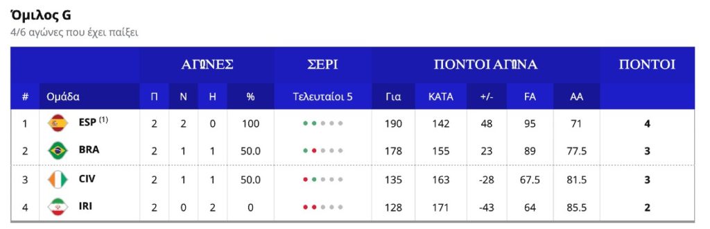 Στον έβδομο όμιλο η Ακτή Ελεφαντοστού νίκησε δύσκολα το Ιράν με 71-69 και έμεινε «ζωντανή» για την πρόκριση. Η Ισπανία δεν αντιμετώπισε κανένα πρόβλημα απέναντι στη Βραζιλία, επικράτησε με 96-78 και προκρίθηκε στην επόμενη φάση.