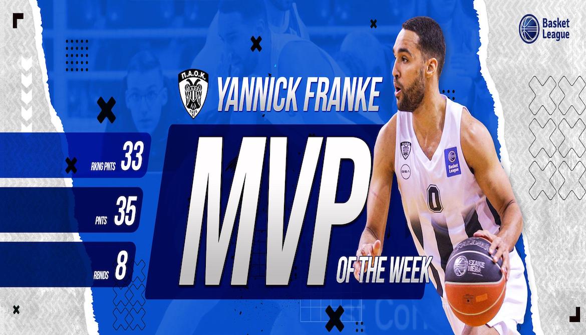 Ο Γιανίκ Φράνκε είχε αναδειχθεί MVP of the Week για την 14η Εβδομάδα της Basket League με τους 30 πόντους που είχε πετύχει στην εντός έδρας νίκη του ΠΑΟΚ επί του Λαυρίου και τους 33 βαθμούς τους οποίους είχε συγκεντρώσει στο ranking.