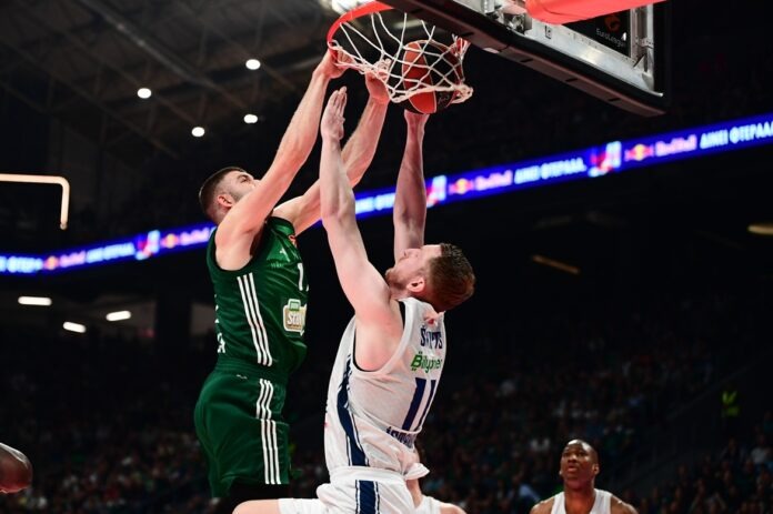 Ο Νίκος Ρογκαβόπουλος πραγματοποίησε ένα εκπληκτικό κάρφωμα σε μια φάση που έδωσε την απαραίτητη ώθηση στους «πράσινους» και ανέβασε τα ντεσιμπέλ στο «Τ-Center».