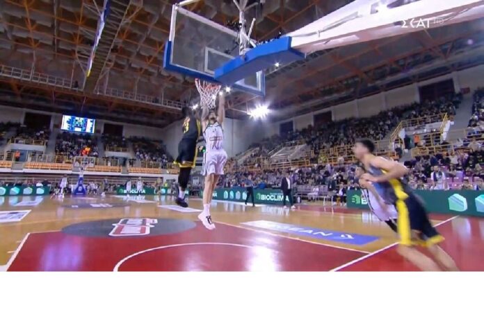 Στο τέλος της πρώτης περιόδου ο Κώστας Σλούκας έκλεψε την μπάλα από τον Δημήτρη Κατσίβελη και έδωσε πάσα στον Χουάντσο Ερνανγκόμεθ ο οποίος σηκώθηκε για κάρφωμα χωρίς να υπολογίζει τον Σανόγκο που ήρθε από πίσω του και έκανε το εντυπωσιακό μπλοκ.