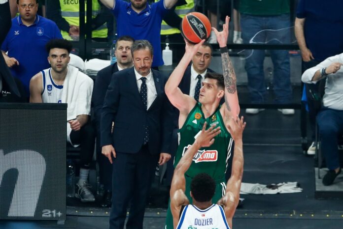 Ο Έλληνας ψηλός των Πρασίνων εκμεταλλεύτηκε την ασίστ του Κώστα Σλούκα και εκτέλεσε ανενόχλητος από τις 45 μοίρες, ανεβάζοντας πάλι την ένταση του ΟΑΚΑ σε υψηλά ντεσιμπέλ.