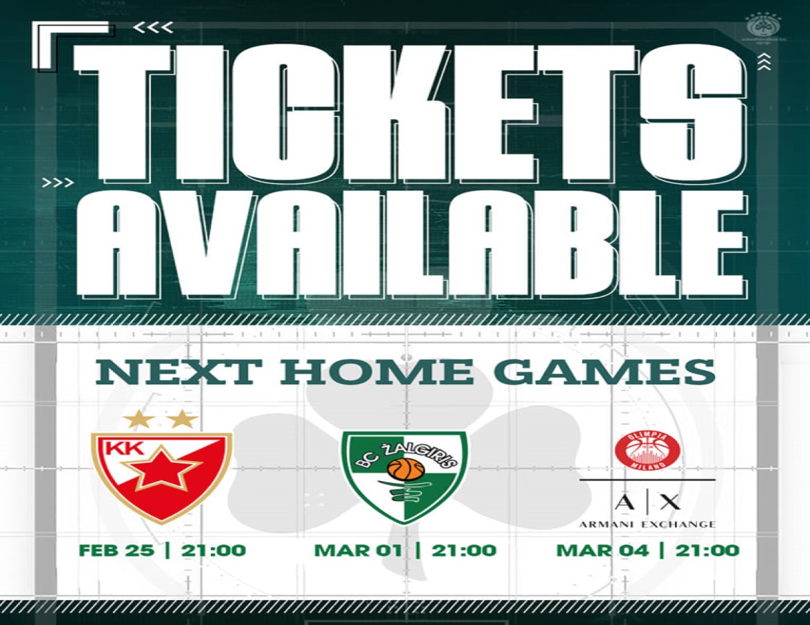Η ΚΑΕ Παναθηναϊκός ΟΠΑΠ ενημερώνει τους φιλάθλους της πως τέθηκαν σε κυκλοφορία τα εισιτήρια για την αναμέτρηση της Παρασκευής με τον Crvena Zvezda mts Belgrade (25/2, 21.00), καθώς και για εκείνες με τις Zalgiris Kaunas (1/3, 21.00) και AX Armani Exchange Milan (4/3, 21.00).