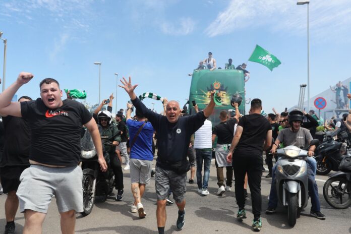 Η... λαοθάλασσα που βρέθηκε στο αεροδρόμιο δεν έχει χάσει στιγμή το λεωφορείο που μεταφέρει την αποστολή του Παναθηναϊκού από το αεροδρόμιο στο ΟΑΚΑ, κάτι που προκάλεσε χαμό στους δρόμους.