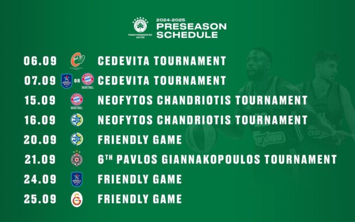 Την ημέρα του Τουρνουά (21/9) οι πράσινοι θα αντιμετωπίσουν την Partizan Mozzart Bet Belgrade, ενώ την προηγούμενη (20/9) θα δώσουν φιλικό προπονητικού χαρακτήρα με την Maccabi Playtika Tel Aviv στο ΔΑΚ Γλυφάδας, κεκλεισμένων των θυρών.