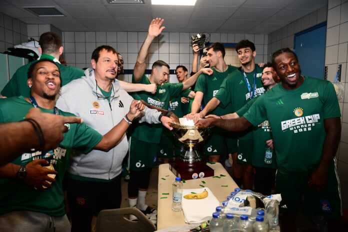 Στα αποδυτήρια των πρασίνων ξέσπασαν ξέφρενοι παννηγυρισμοί για τη κατάκτηση του πρώτου τίτλου για το 2026, με παίχτες και προπονητές να γίνονται ένα.