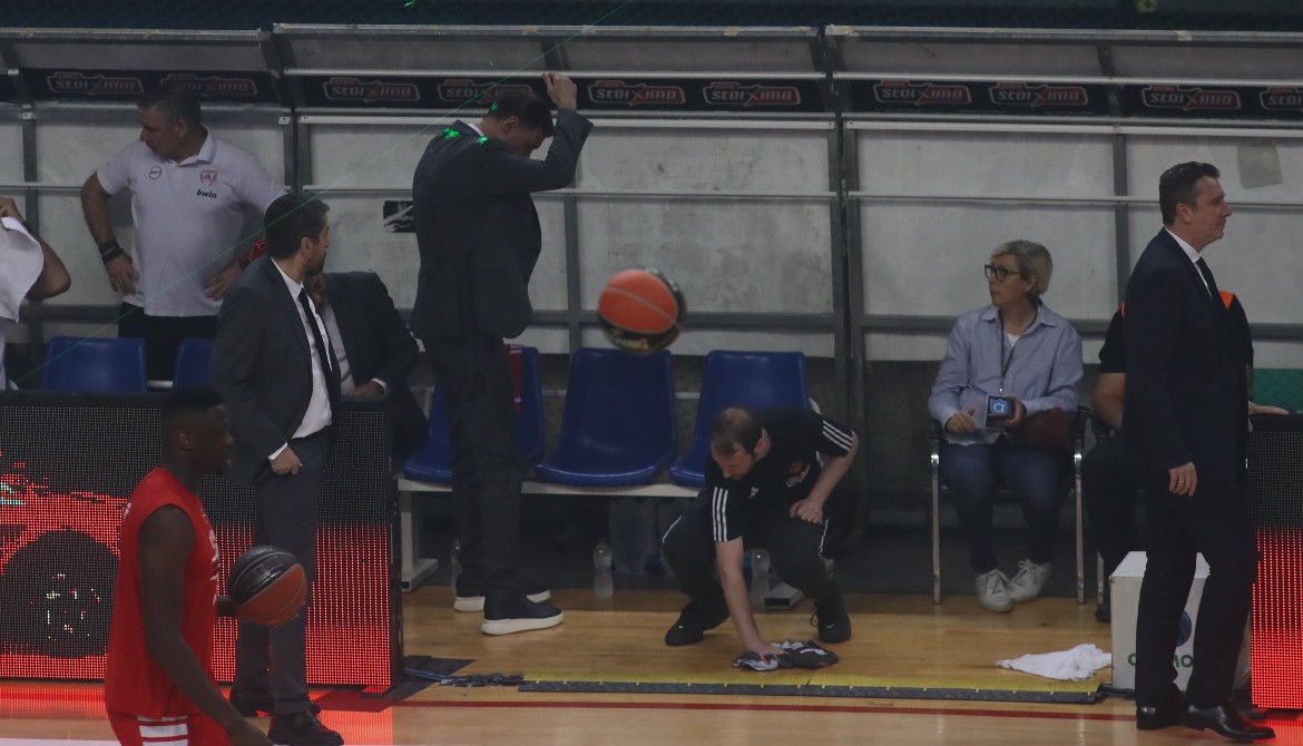 Όπως στο Game 2 της σειράς των τελικών της Basket League, έτσι και πριν από το τζάμπολ του Game 4 οι οπαδοί του Παναθηναϊκού πέταξαν νερά στον πάγκο του Ολυμπιακού.