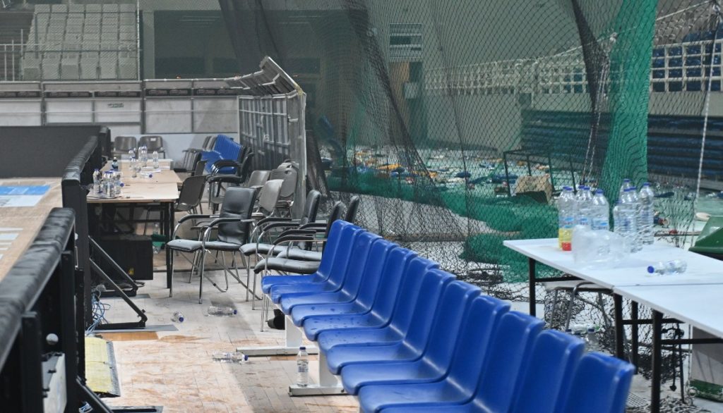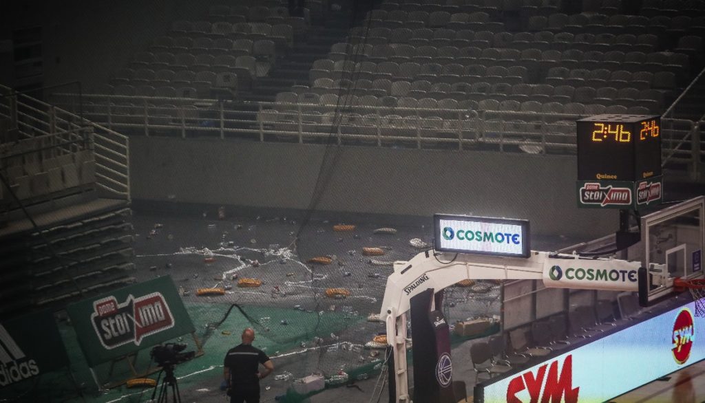 Στο προστατευτικό δίχτυ που βρίσκεται περιμετρικά του αγωνιστικού χώρου κατέληξαν αμέτρητα σπασμένα καθίσματα, αμέσως μετά από την απόφαση για εκκένωση του ΟΑΚΑ.