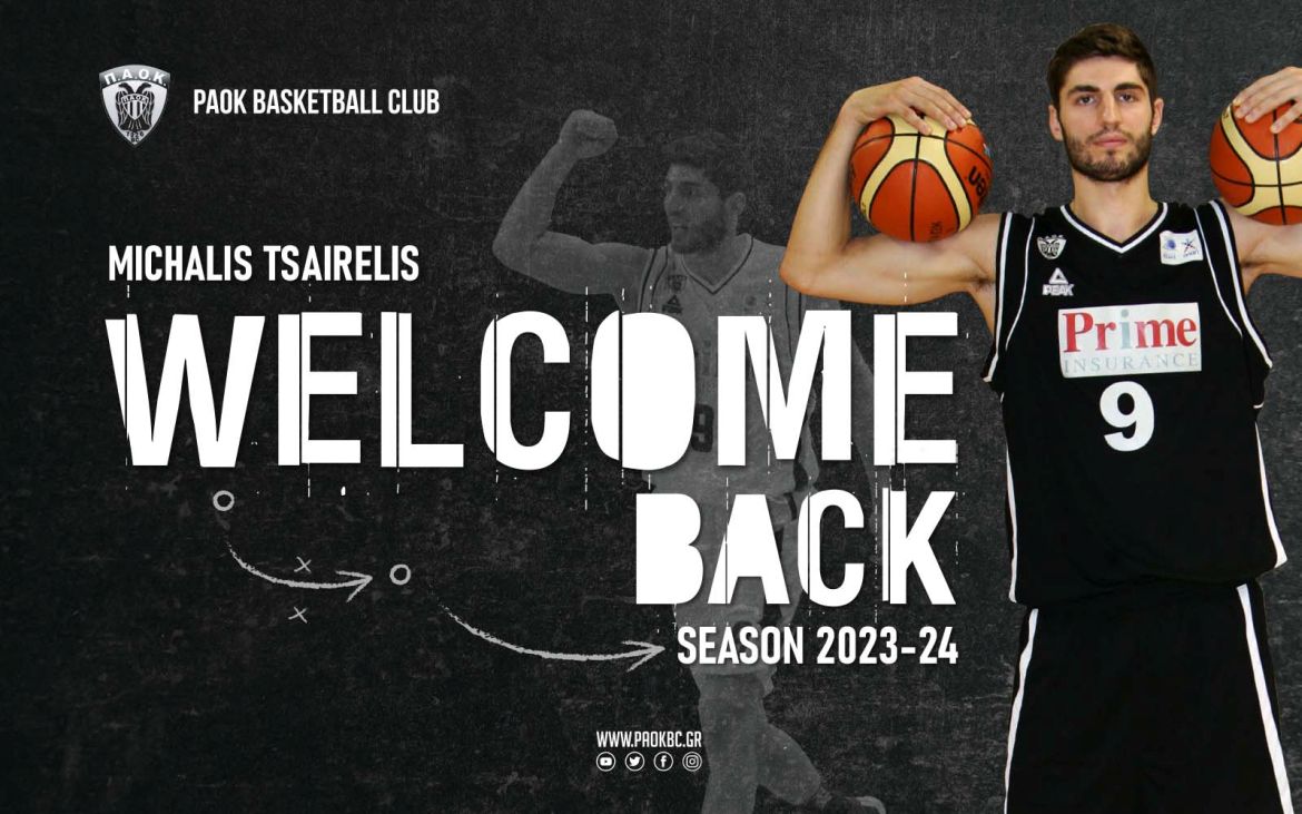 "Η ΚΑΕ ΠΑΟΚ ανακοινώνει την συμφωνία με τον Μιχάλη Τσαϊρέλη, ο οποίος επιστρέφει στην ομάδα μας μετά από 9 χρόνια και την επιτυχημένη συνεργασία της διετίας 2012-14. Ο Μιχάλης θα φορέσει την ασπρόμαυρη φανέλα για τα επόμενα δύο χρόνια. Τον καλωσορίζουμε και πάλι στη μεγάλη οικογένεια του ΠΑΟΚ.
