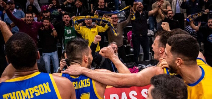 Με συνθήματα, αλλά και καπνογόνα, πανηγύρισαν την πρόκριση του Περιστερίου στο Final Four του Basketball Champions League οι φίλαθλοί του.